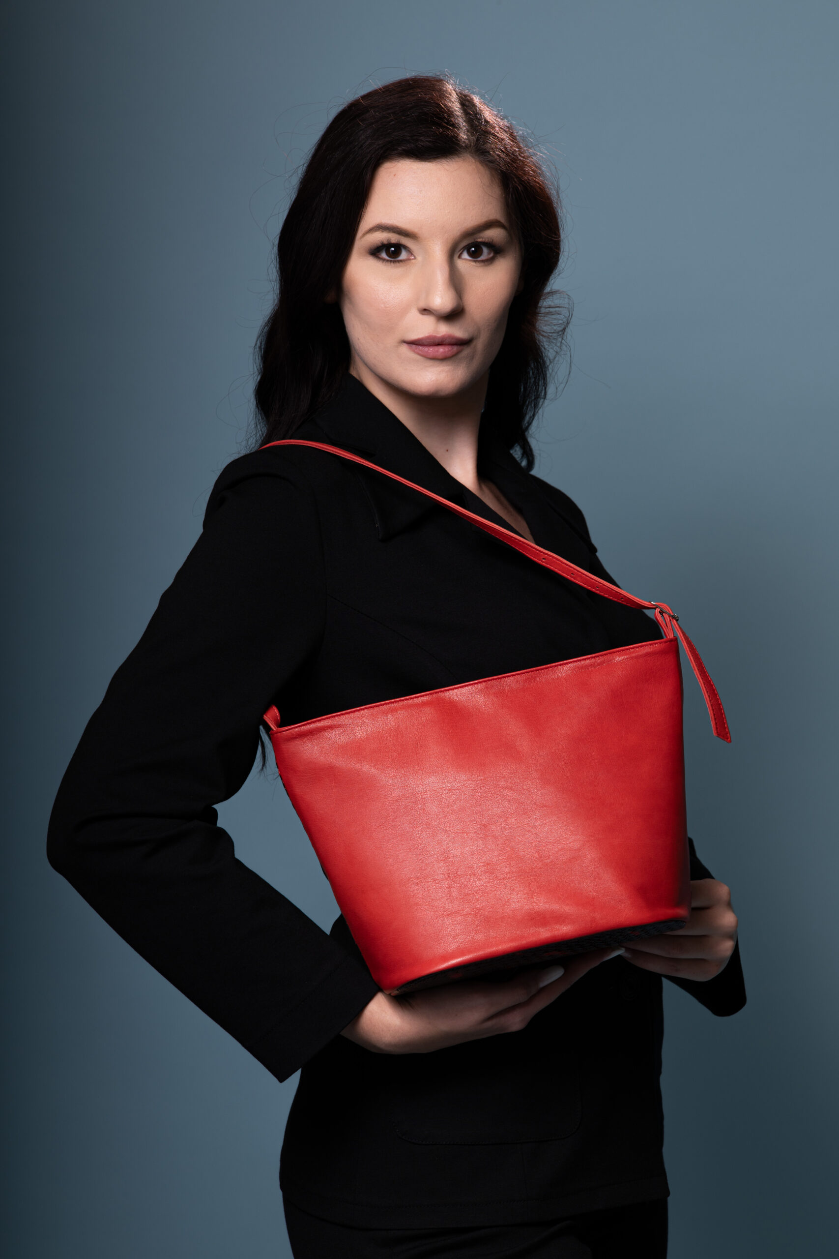 Ardor – Latin for “Passion” – channels fiery elegance and artistic intensity in a sculptural bucket bag. Crafted from smooth red leather, this striking piece radiates confidence and refined boldness. It features one of only 66 original Adele Frank sgraffito enamel buttons—each a wearable work of art in its own right.