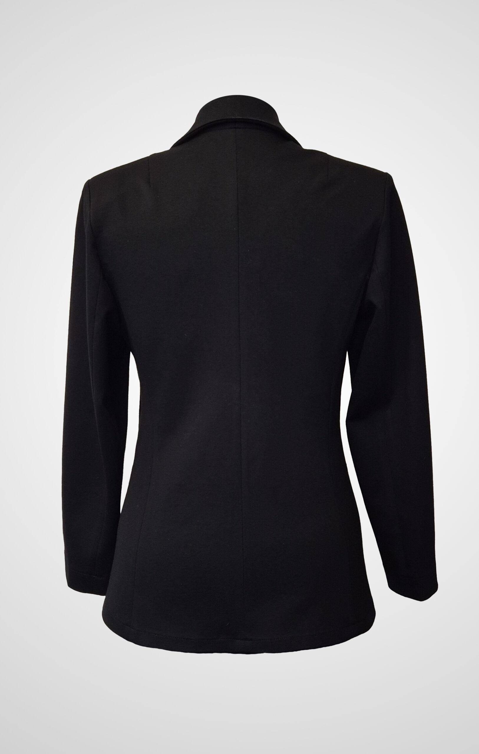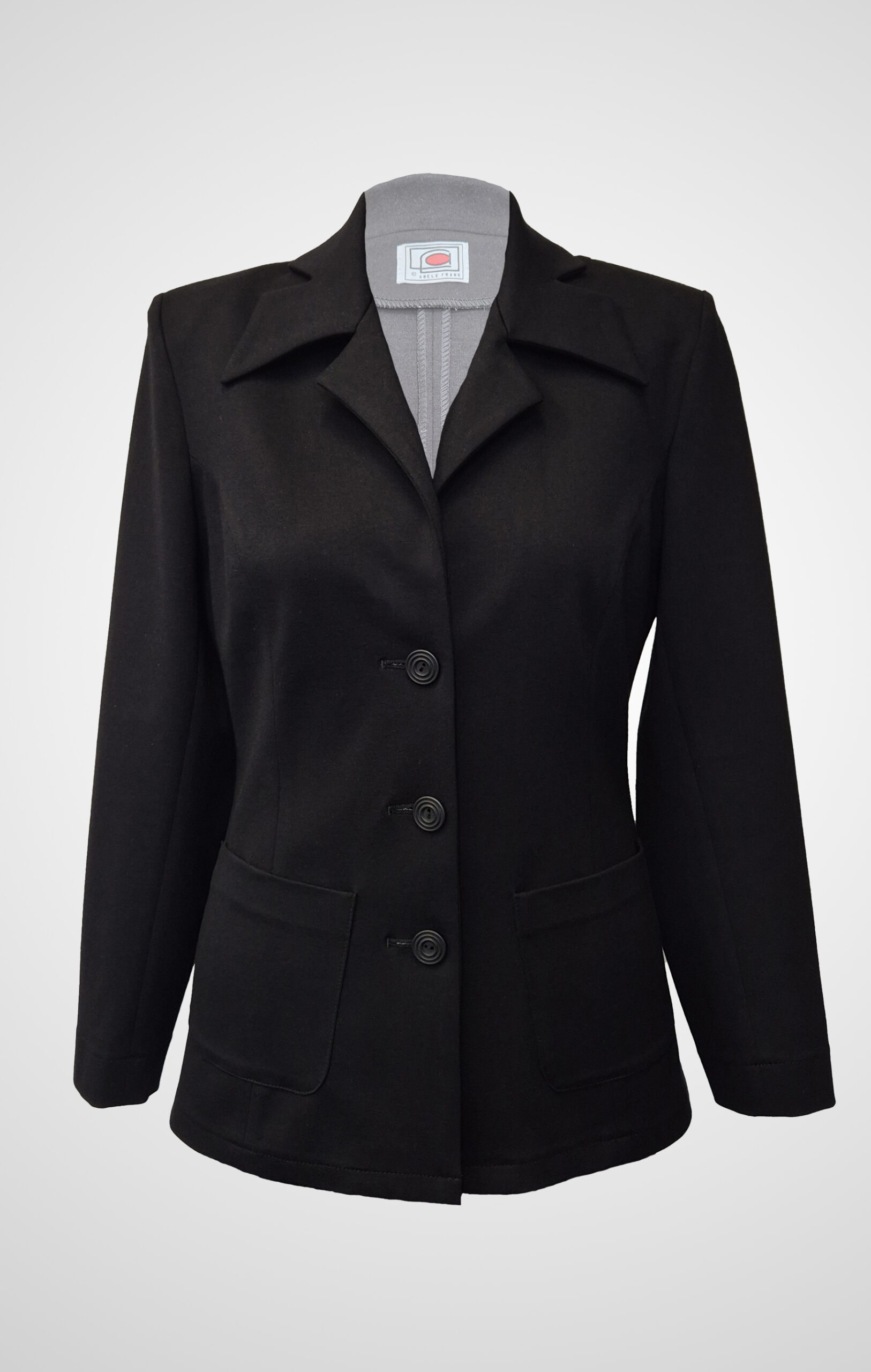 Crafted from subtly elastic black fabric, it combines sleek tailoring with ease of movement. The unlined construction keeps it light and versatile, while the three-button closure and two front patch pockets add practical detail and visual balance.