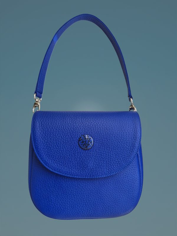 Cobalta Sigillum – Latin for “Cobalt Seal” – captures the essence of strength, elegance, and identity. This refined shoulder bag, sculpted from luminous cobalt-blue leather, is defined by clean architectural lines and a timeless saddle silhouette. At its center rests Adele Frank’s signature sgraffito enamel button — a handmade seal of artistry, where each etching tells a story as unique as its wearer.