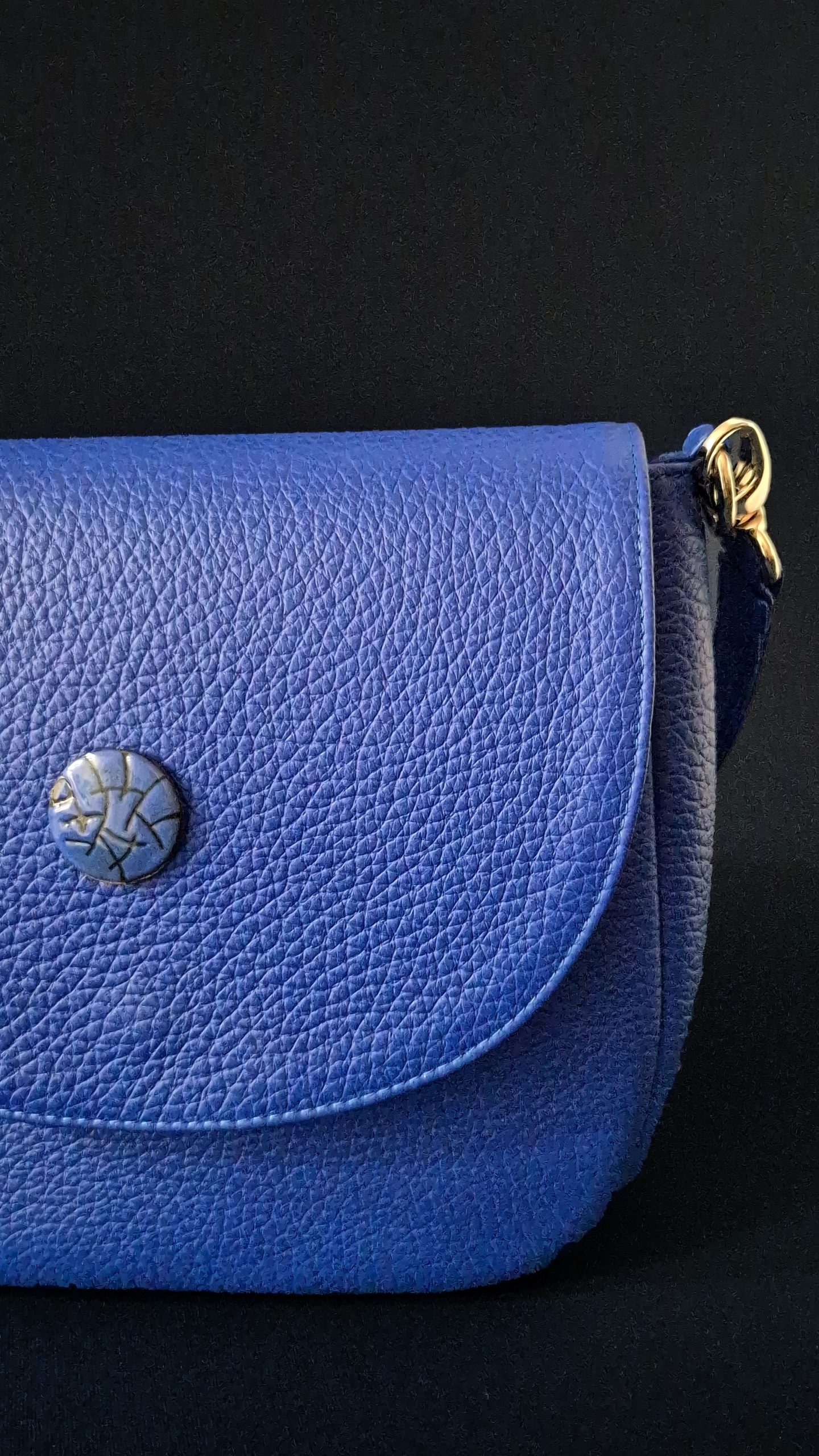 Cobalta Sigillum – Latin for “Cobalt Seal” – captures the essence of strength, elegance, and identity. This refined shoulder bag, sculpted from luminous cobalt-blue leather, is defined by clean architectural lines and a timeless saddle silhouette. At its center rests Adele Frank’s signature sgraffito enamel button — a handmade seal of artistry, where each etching tells a story as unique as its wearer.