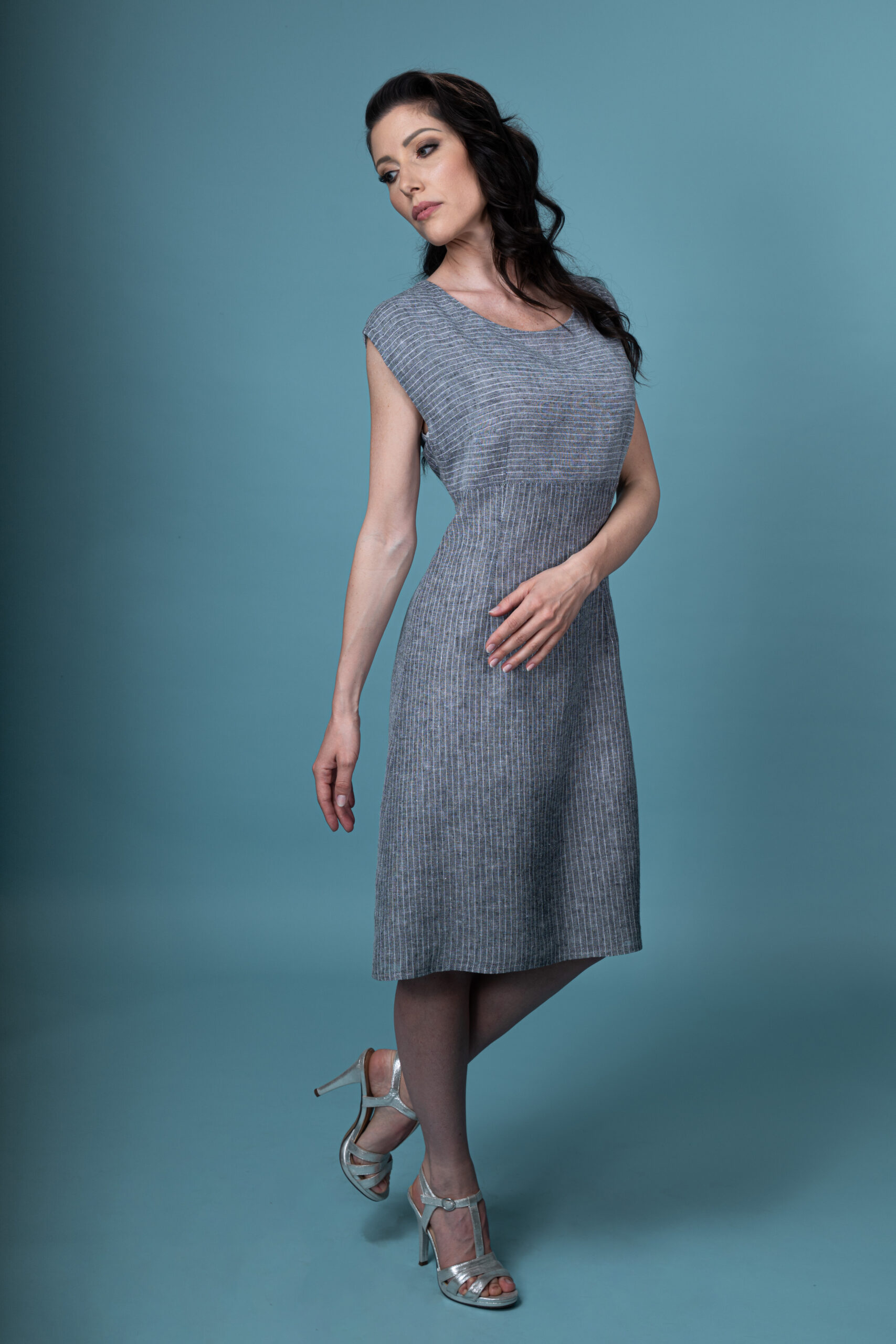 Luna Alba — Latin for “white moon” — evokes quiet luminosity and refined elegance. This empire silhouette dress features minimal dropped shoulders and a feminine underbust seam. Together, they create a sculptural yet fluid shape. Made from pure linen in soft grey and white stripes, the fabric is lightweight yet structured. Fully lined in natural fibres, it strikes a perfect balance between structure and lightness. This dress embodies the essence of sustainable luxury.