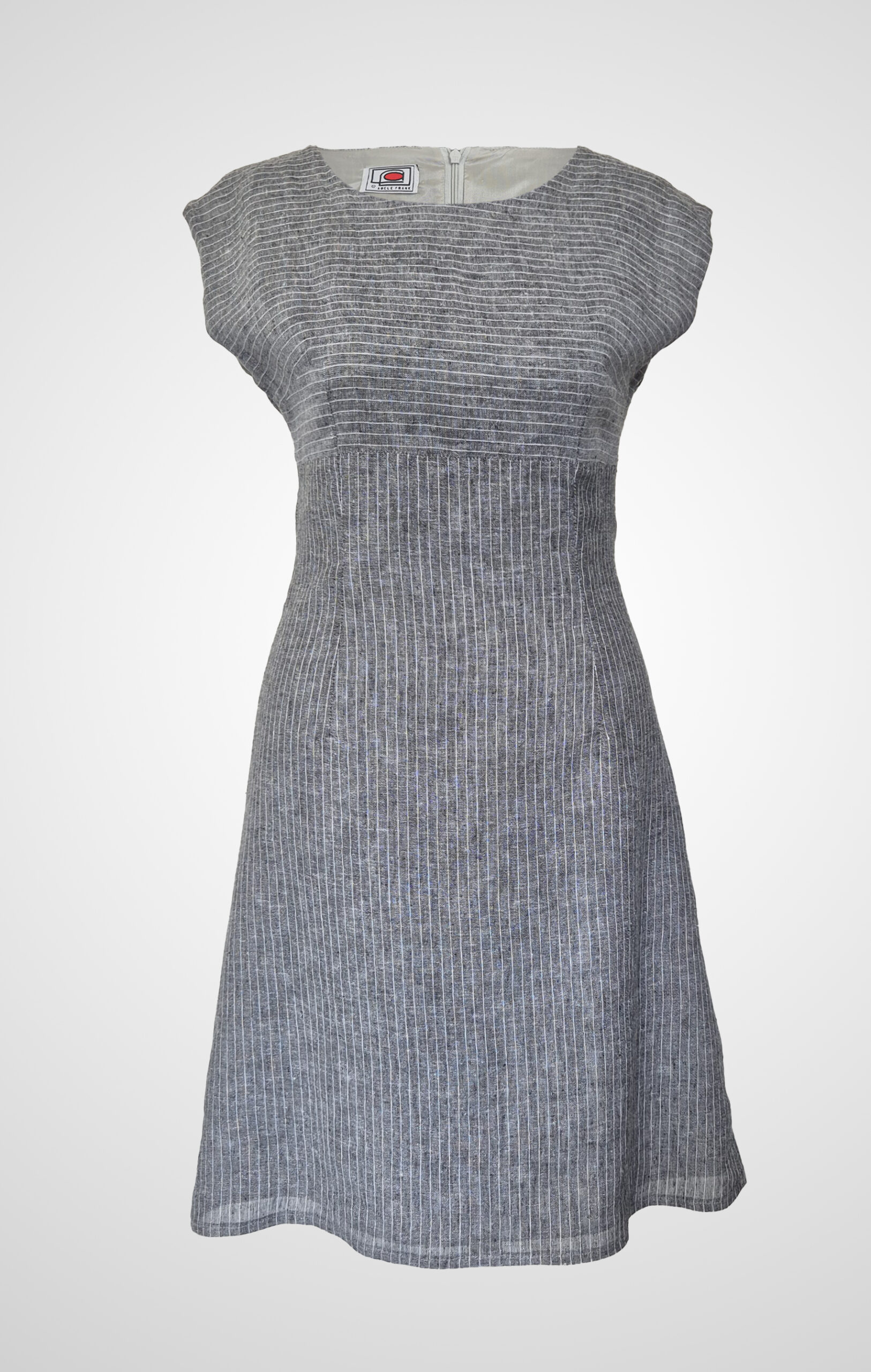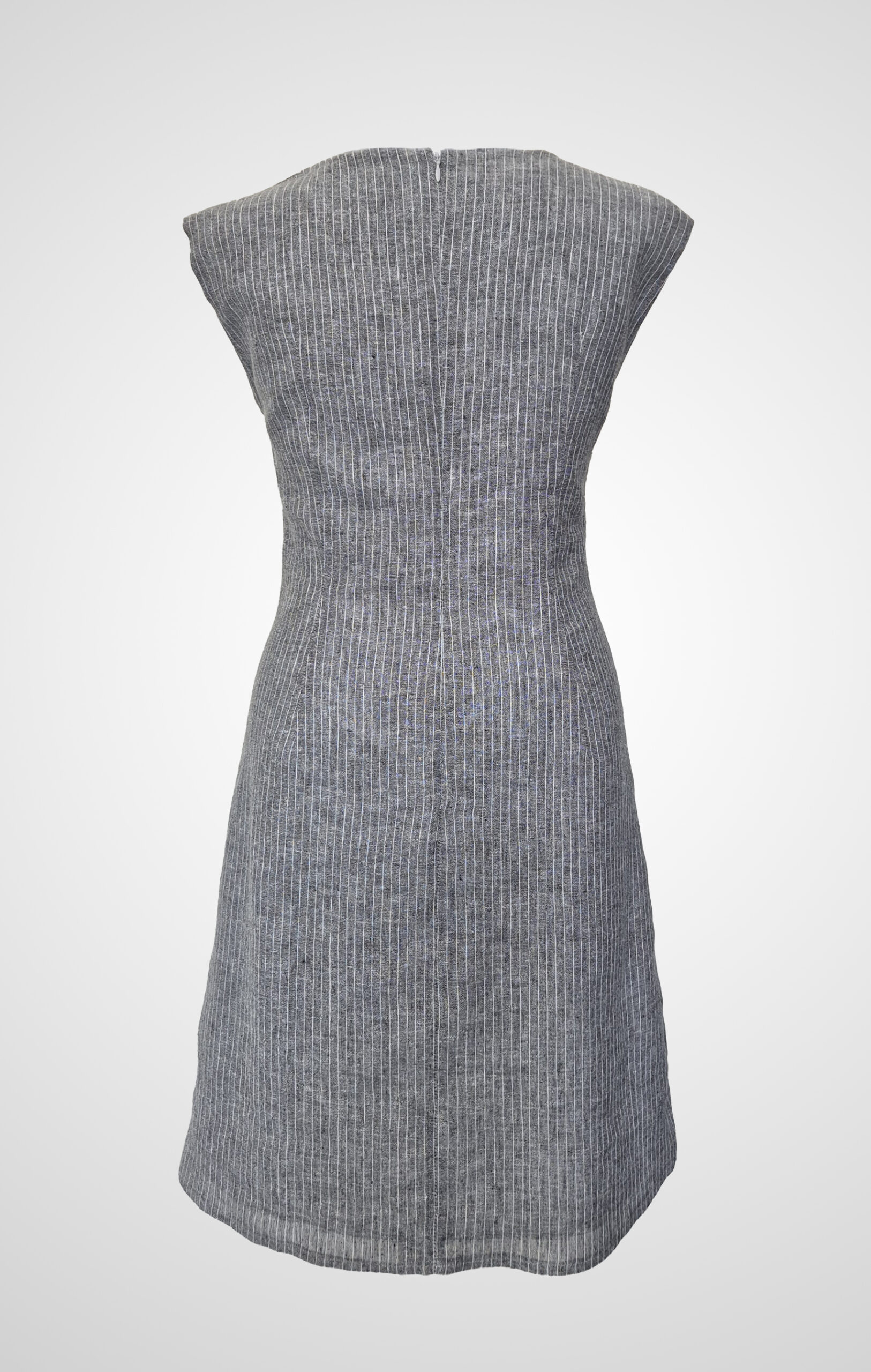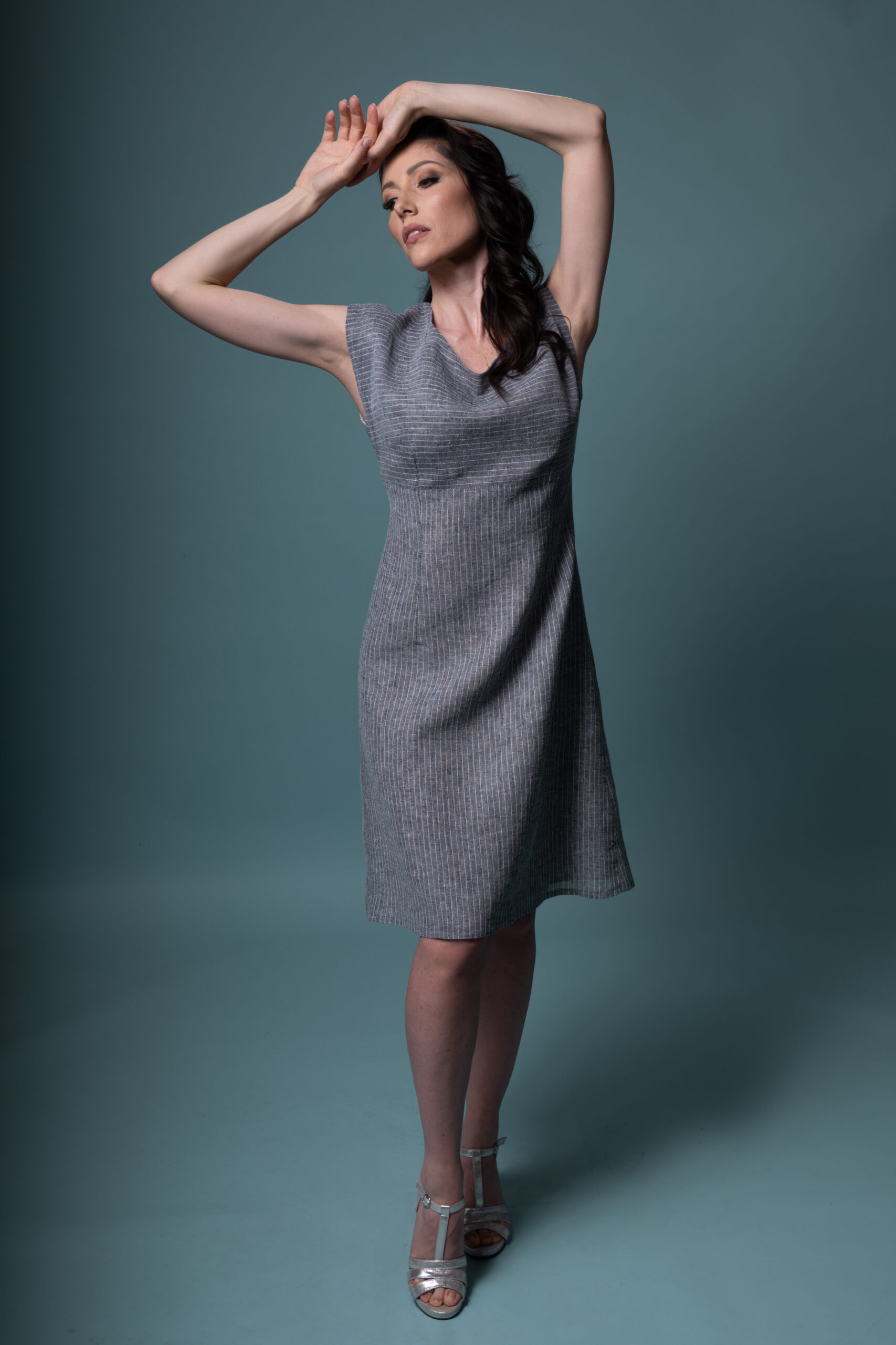 Luna Alba — Latin for “white moon” — evokes quiet luminosity and refined elegance. This empire silhouette dress features minimal dropped shoulders and a feminine underbust seam. Together, they create a sculptural yet fluid shape. Made from pure linen in soft grey and white stripes, the fabric is lightweight yet structured. Fully lined in natural fibres, it strikes a perfect balance between structure and lightness. This dress embodies the essence of sustainable luxury.