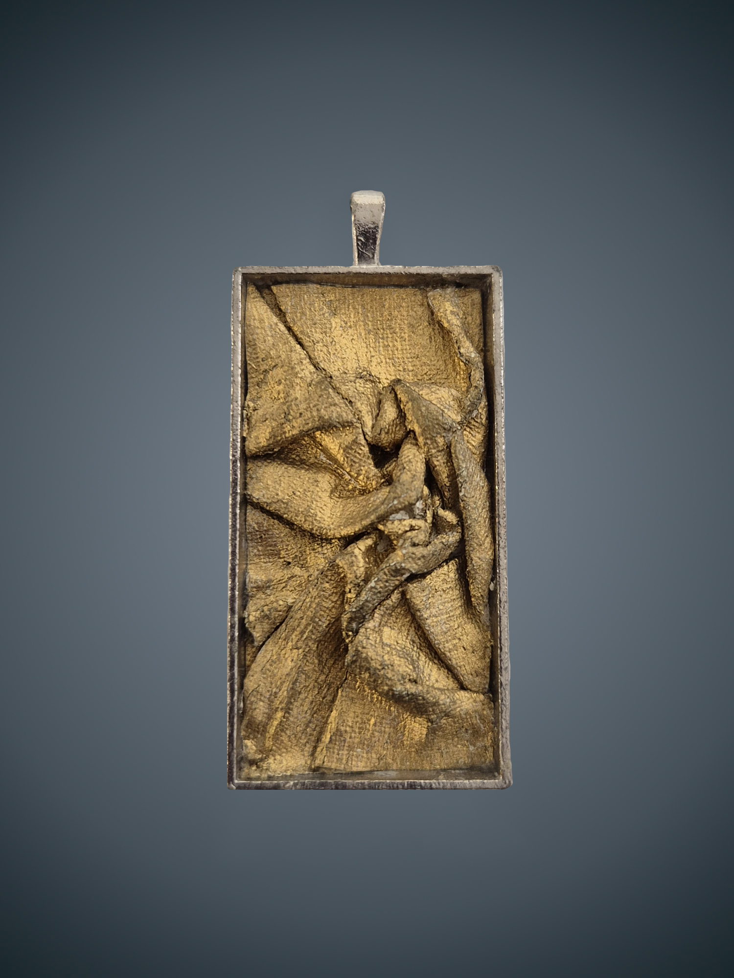 Pliora Nr°01 is a unique pendant crafted from hand-painted gold-toned canvas. Suspended from a sterling silver necklace, this sculptural piece is a true work of art. It combines elegance with a one-of-a-kind design, showcasing Adele Frank’s signature craftsmanship.