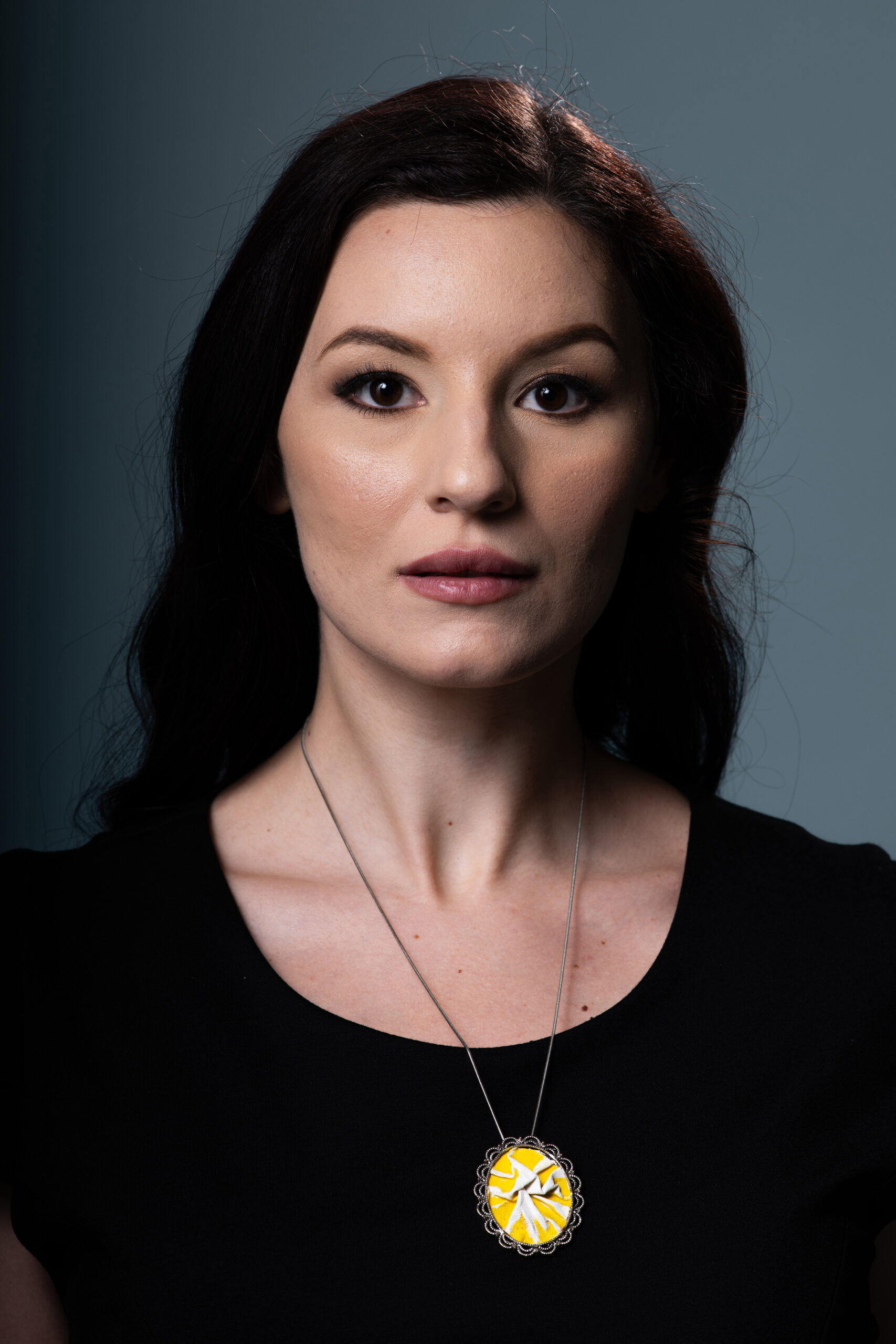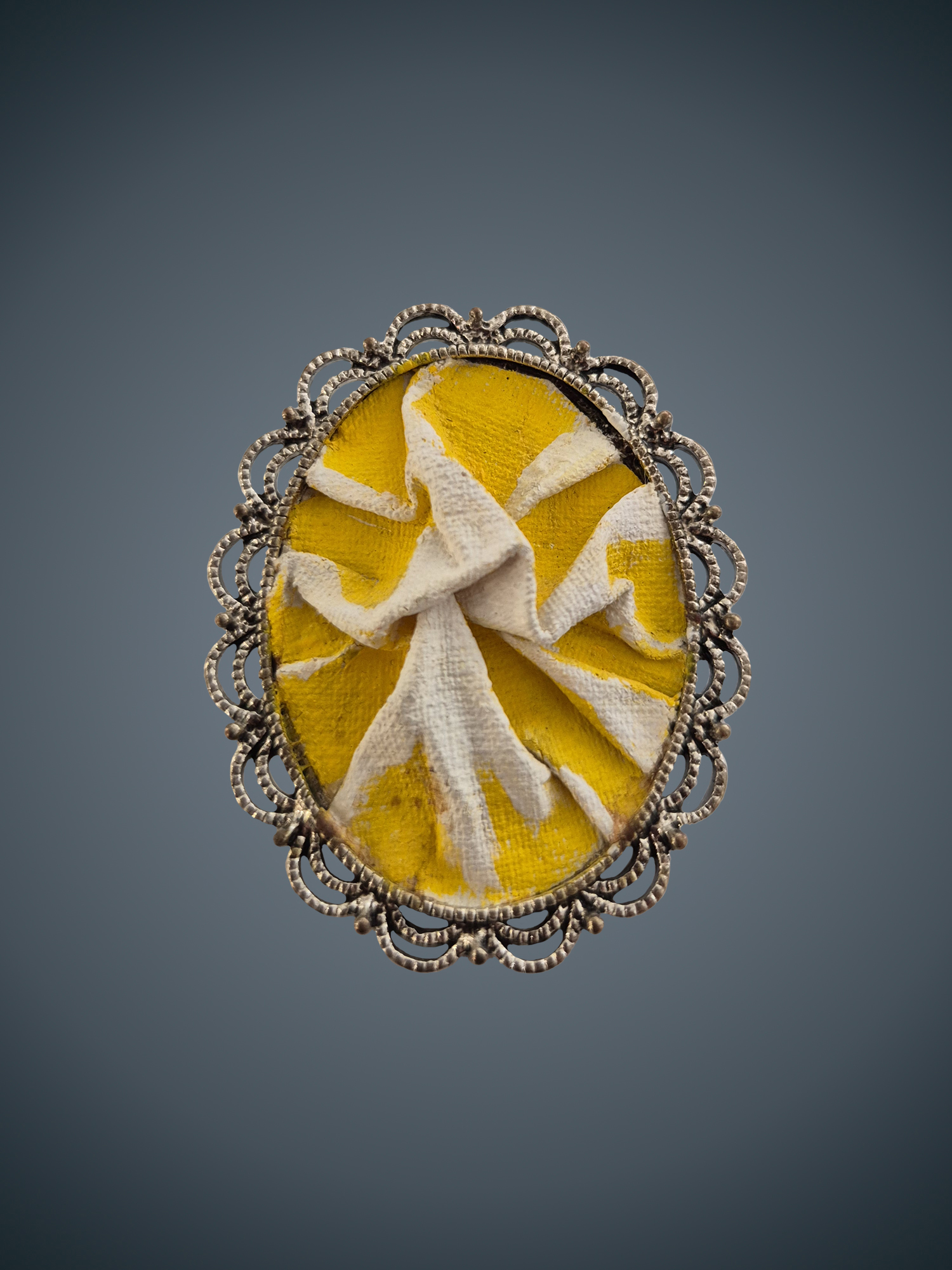 Pliora Nr°06 is a unique pendant crafted from hand-painted yellow canvas. Suspended from a sterling silver necklace, this sculptural piece is a true work of art. It combines elegance with a one-of-a-kind design, showcasing Adele Frank’s signature craftsmanship.