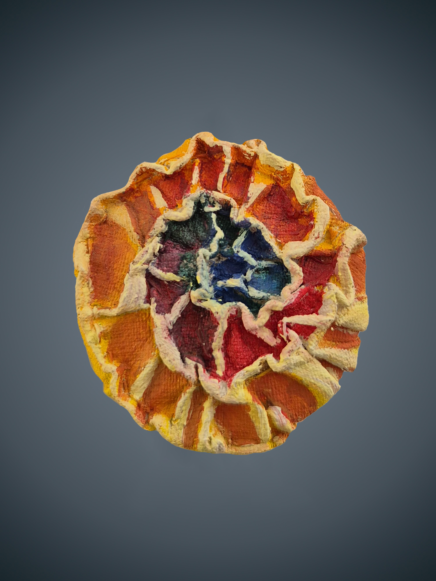 Pliora Nr°12 is a unique pendant crafted from hand-painted canvas. Suspended from a sterling silver necklace, this sculptural piece is a true work of art. It combines elegance with a one-of-a-kind design, showcasing Adele Frank’s signature craftsmanship.
